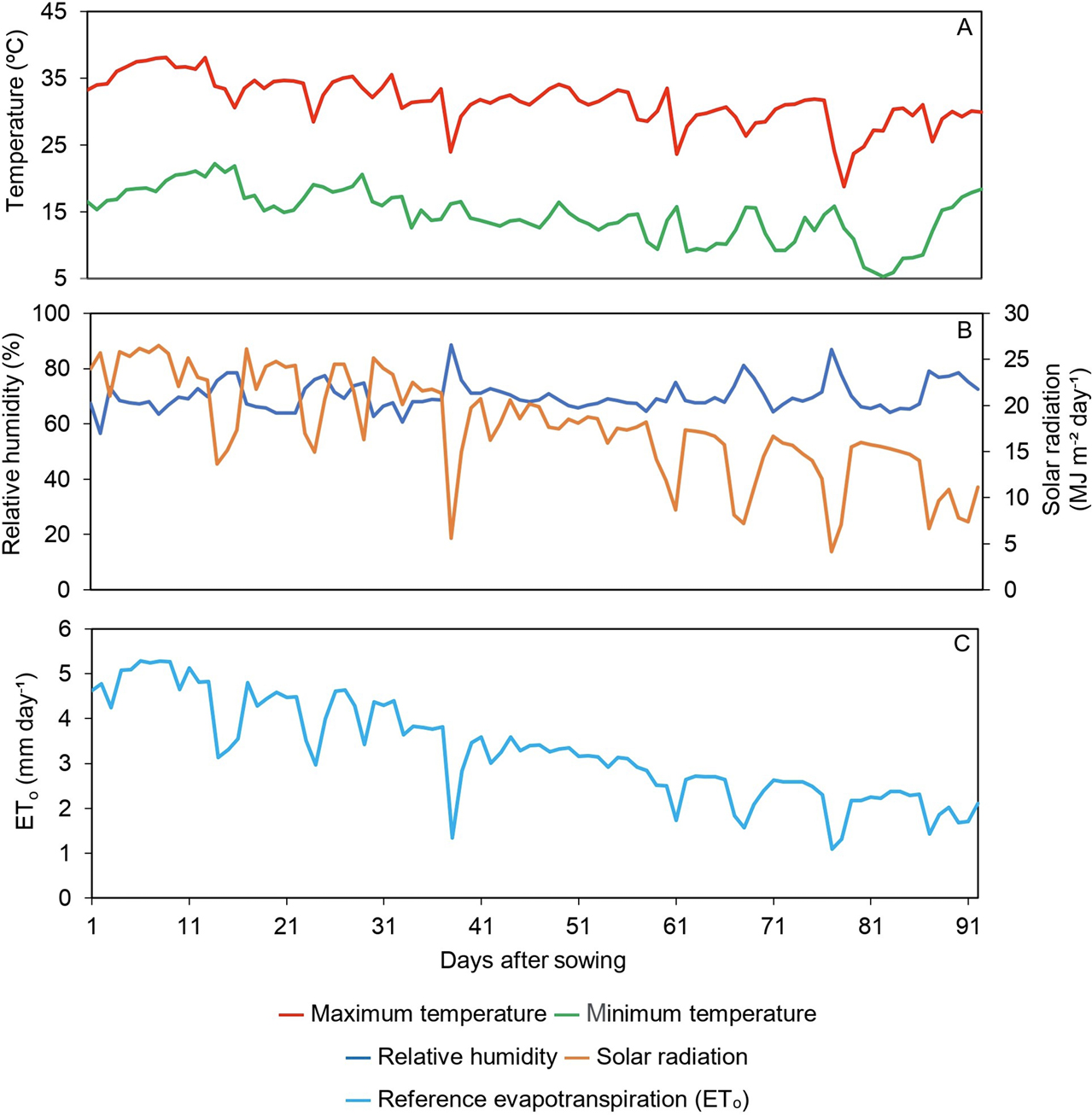 Air temperature, relative humidity, and global solar radiation were recorded inside the shelter area at 2 m height and the reference evapotranspiration (ETo) was calculated using the Penman-Monteith method (Allen et al., 1998) (Figure 1).