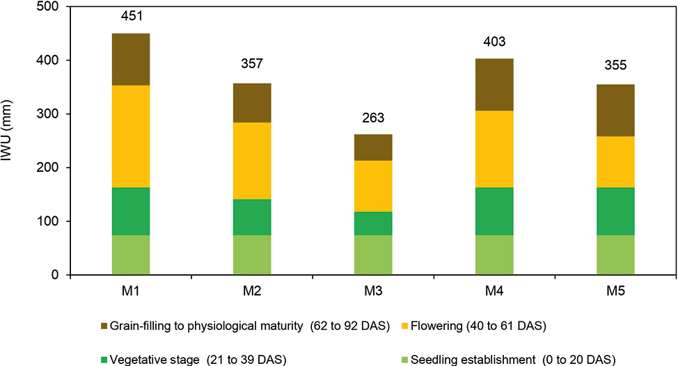The total amount of IWU to the experimental common bean differed depending on the strategies irrigation treatments (Figure 3). 451, 357, 263, 403 and 355 mm of irrigation water were applied throughout the growing season in treatments M1, M2, M3, M4 and M5, respectively. At the seedling establishment stage (0 to 20 DAS) all treatments received 74 mm of irrigation water. In the vegetative stage (21 to 39 DAS) the IWU in treatments M1, M4 and M5 was 89 mm and in treatments M2 and M3 it was 67 and 44 mm. During flowering (40 to 61 DAS) the crop received the highest amount of irrigation water, 190, 143, 95,143 and 95 mm for treatments M1, M2, M3, M4 and M5, respectively. During grain-filling to physiological maturity (62 to 92 DAS) the IWU was 97, 73, 49, 97 and 97 mm for treatments M1, M2, M3, M4 and M5.