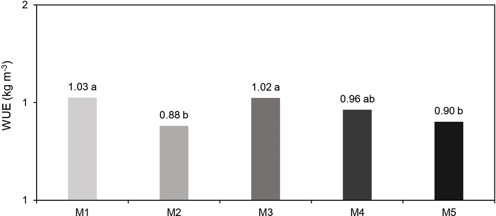 Water use efficiency in this study ranged from 1.03 to 0.90 kg·m-3 (Figure 4). The WUE of M3 and M4 was similar to that of M1, whereas it was reduced for M2 and M5. This could be because common bean invests photosynthetic resources for root production per unit water used to extract more water under drought conditions, but this strategy is insufficient to increase WUE for biomass and grain (Webber et al., 2006). Considering that the yield penalty was significant for M3, the WUE of M4 could be considered the best option to save water (a water reduction of 48 mm) while maintaining a substantial yield (3.9 Mg·ha-1). These results are also relevant because future drought stress patterns for central Brazil suggest stress on the reproductive stage (Heinemann et al., 2016).