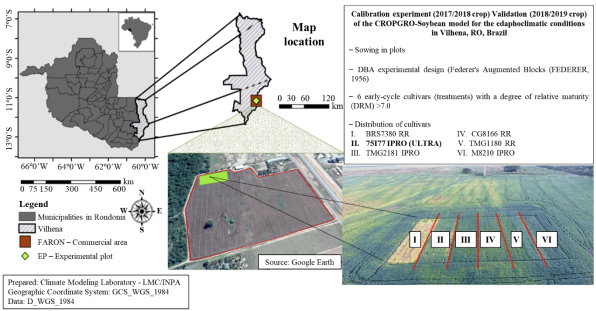 The experiment was conducted during the 2017/2018 and 2018/2019 crop seasons at the Faculdade Marechal Rondon (FARON), in the municipality of Vilhena, RO, Brazil, whose geographical coordinates are 60°05´ W and 12°46´ S, at 600 m altitude (Figure 1). The field plots were located in the mesoregion known as the Southern Cone of Rondônia (SCRO), where soybean is normally sown in the no-tillage system as a succession crop with maize (Nóia Júnior and Sentelhas, 2019). The predominant soil of the region is classified as dystrophic Red-Yellow Latosol, characterized by a flat relief (Crestani Mota et al., 2024). The climate is the Am type, defined as rainy tropical with a well-defined dry season (Alvares et al., 2013). The average annual rainfall and temperatures are 2,200.0 mm and 24.6 °C, respectively.