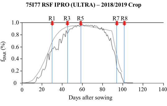 According to Souza et al. (2009), the increased efficiency in the use of the PAR found during the reproductive phase of soybean is reflected in most of the results found for this crop (Confalone and Dujmovich, 1999; Schöffel and Volpe, 2001; Santos et al., 2003; Adeboye et al., 2016). The same authors reported that this increase is closely linked to the progressive accumulation of vegetative and reproductive biomass, becoming markedly significant from the V5 vegetative stage onward. This elevated efficiency persists through subsequent phenological phases and remains pronounced until the onset of the R5 reproductive stage, a critical period when the physiological transition toward reproductive phase occurs, marked by the remobilization of photoassimilates from source tissues to developing sink organs, primarily for grain filling.
