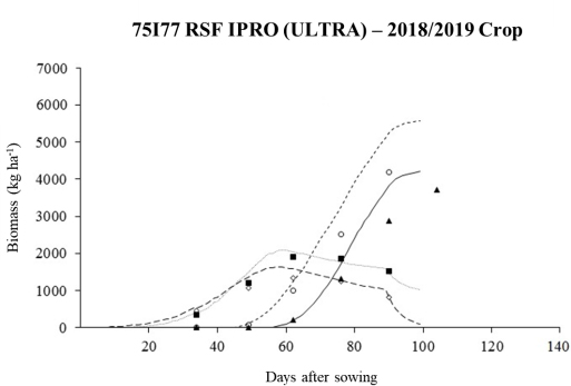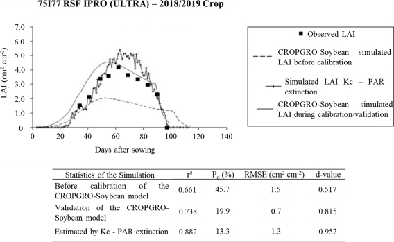 The minimum tillage is another important detail during the validation. According to Mota (2019), the increases in simulated LAIs may also be linked to the increased nitrogen accumulation, an essential nutrient in grain filling and a fundamental prerequisite for high grain yields and quality (Salvagiotti et al., 2008), especially in cultivars with undetermined growth habits, by incorporating maize straws into the soil. This indicates that CROPGRO-Soybean responds differently (systematic error) to this condition in shorter-cycle cultivars, such as 75I77 RSF IPRO (ULTRA). With the appearance of leaves earlier in CROPGRO-Soybean simulations, the period of filling pods coincides with the maximum LAI, in the same way as the redistribution of mineral nutrients, carbohydrates, and nitrogen compounds in grains, stems, branches, and senescent leaves during this phase (Mundstock and Thomas, 2005).