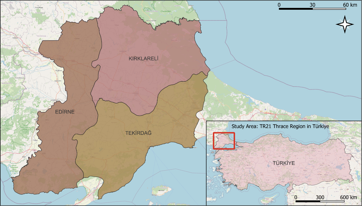 The research area is located in Türkiye. TR21 Thrace Region covers the provinces of Tekirdağ (TR211), Edirne (TR212), and Kırklareli (TR213). The surface area of the region (excluding lakes) is 18.665 km2. Agricultural activities are intensively carried out in the region, and the proportion of land suitable for agriculture is quite high (TDA, 2010). The study area is shown in Figure 1.