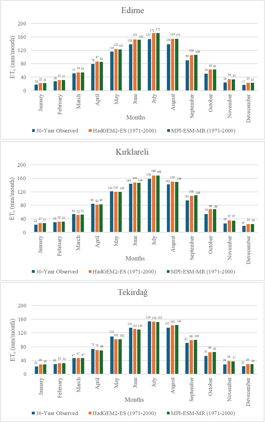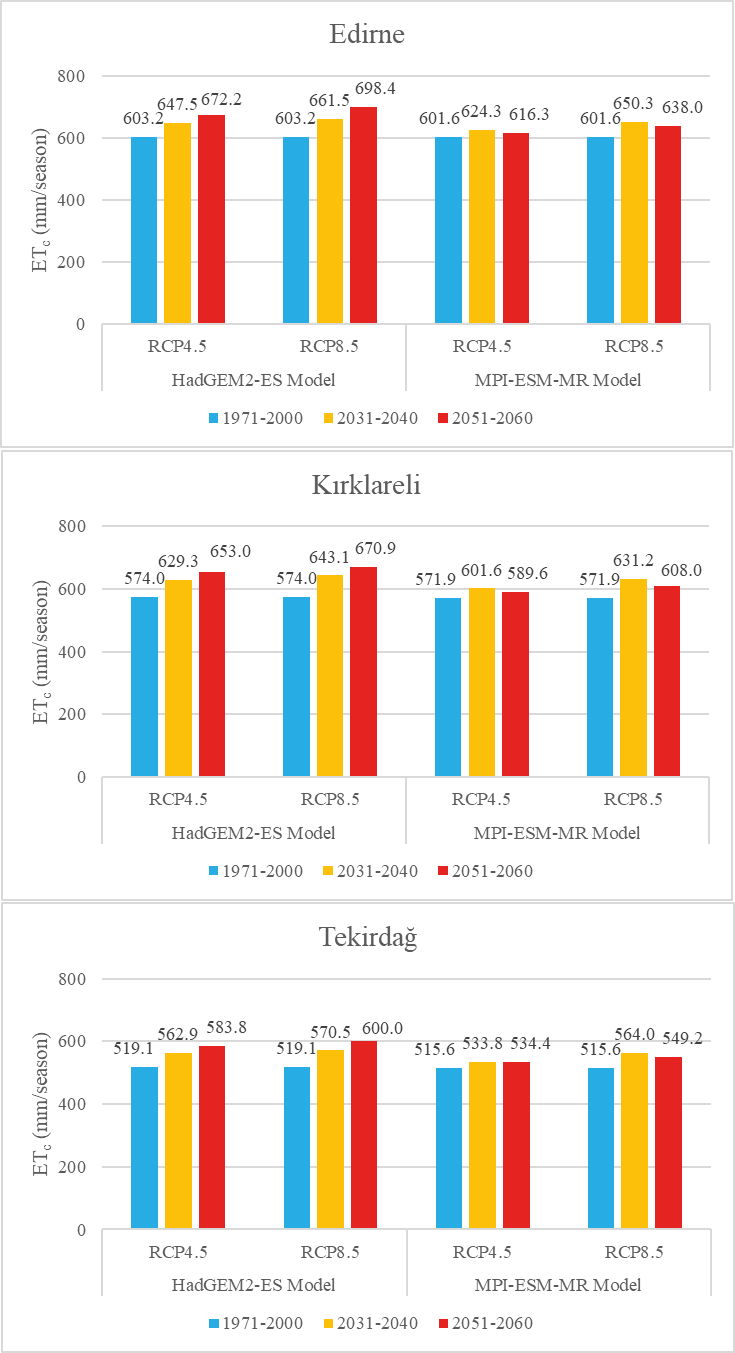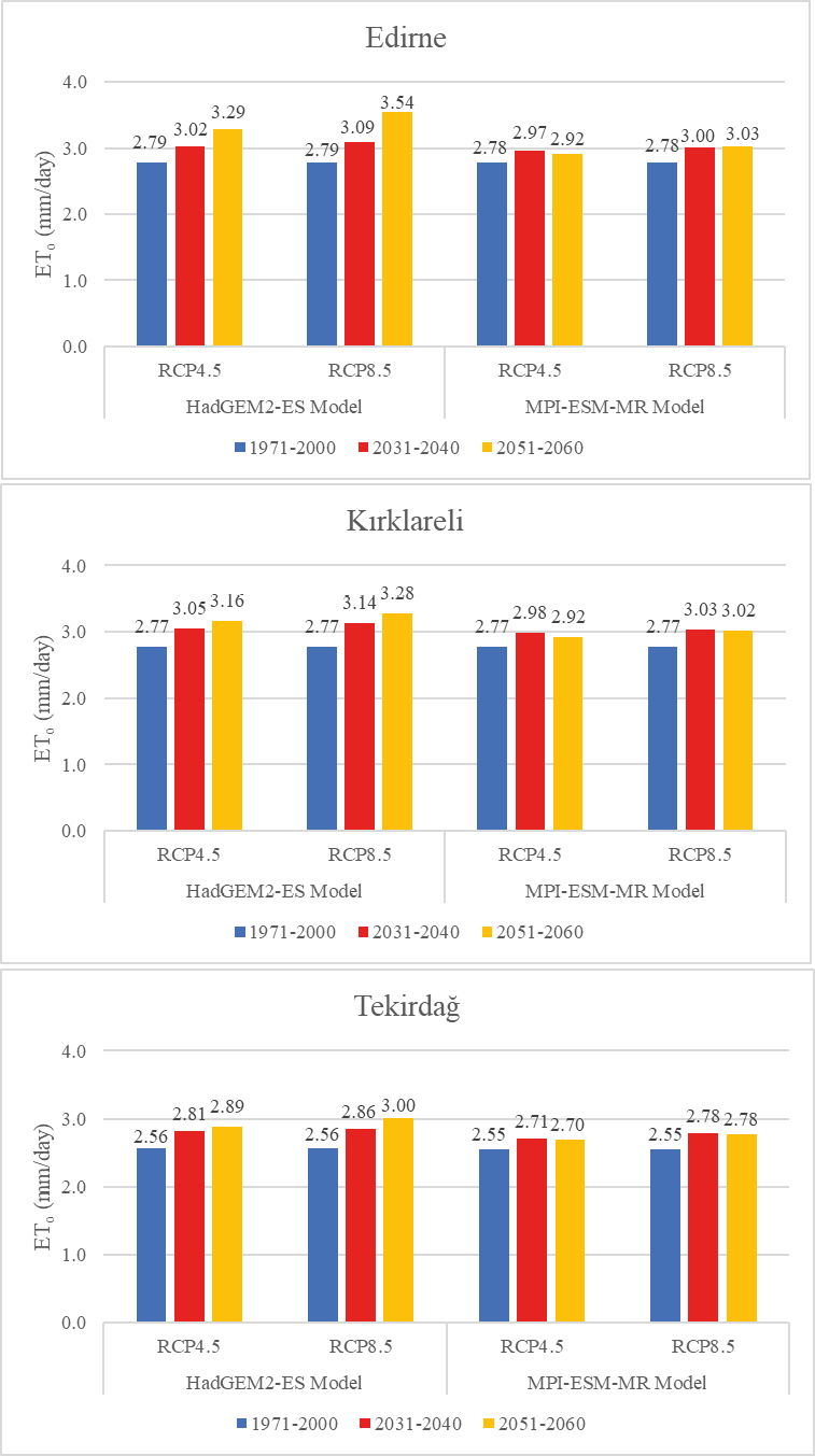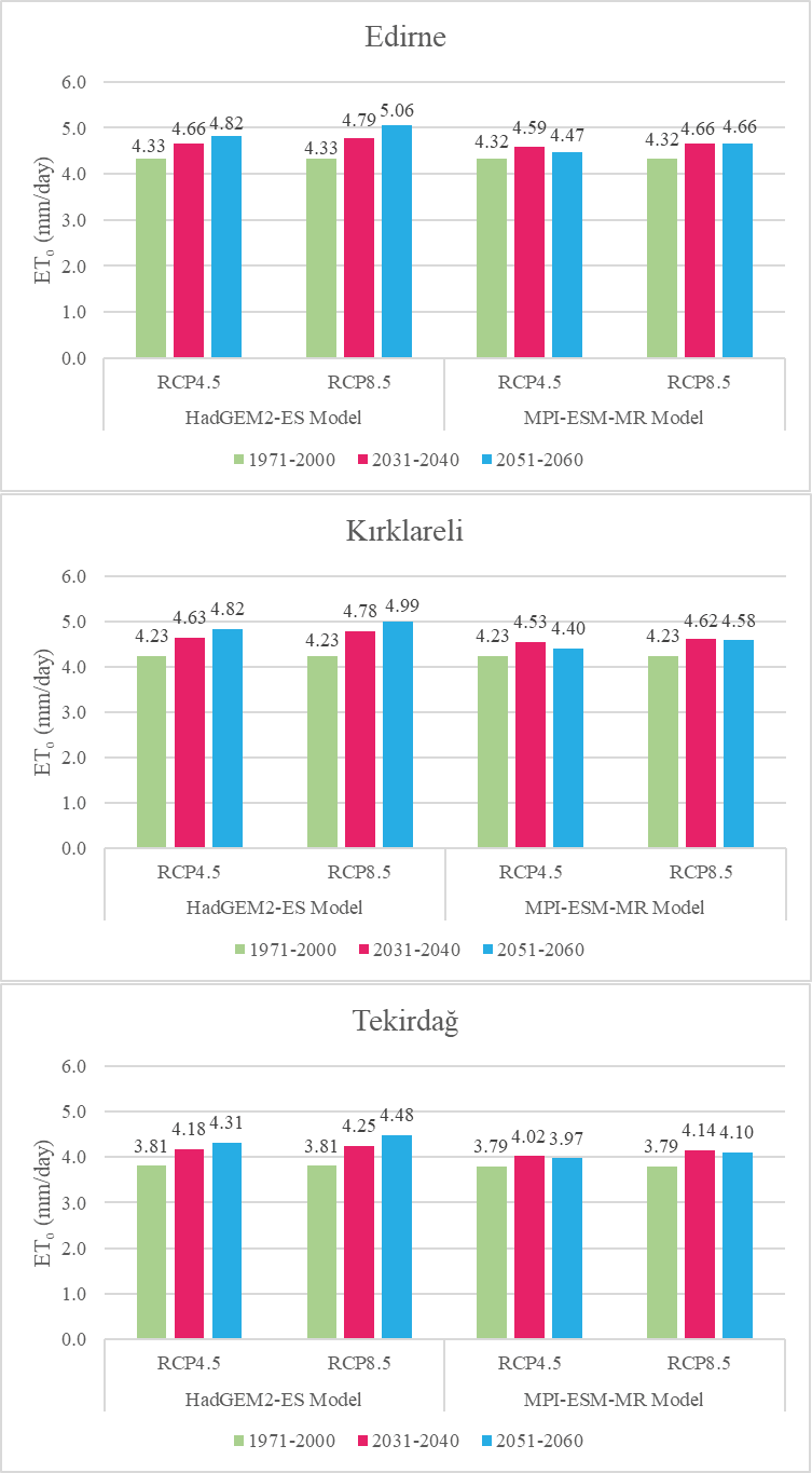 ET0 is predicted to increase in three locations in both models and both scenarios compared to the reference period (Edirne (4.9%-26.9%), Kırklareli (5.3%-18.3%), and Tekirdağ (5.7%-17.5%)) (Table 4).