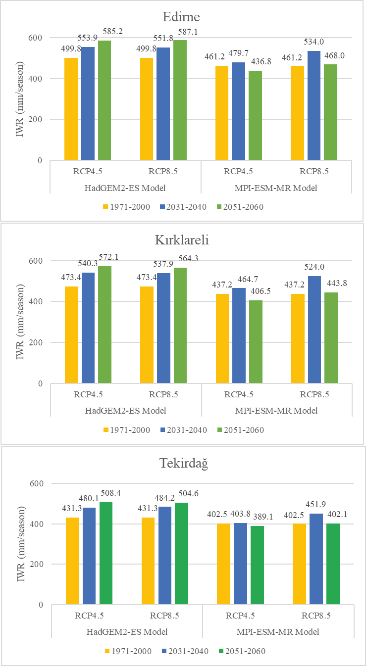 IWR is predicted to increase in the period 2051-2060 in Edirne, Kırklareli, and Tekirdağ in the RCP4.5 scenario in the MPI-ESM-MR model. In addition, in Tekirdağ, the same model predicted a decrease in the RCP8.5 scenario for the same period and an increase in all other forecasts (Table 7).