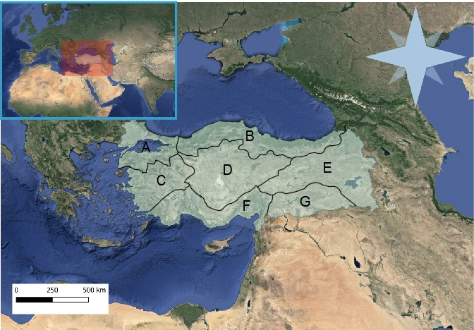 Türkiye is located between 26°-45° E longitude and in 36°-42° N latitude in the Northern Hemisphere. Its surface area is approximately 780000 km2. 3% of Türkiye’s surface area is in the European continent (Thrace) and 97% is in the Asian continent (Anatolia). Türkiye is bordered to the west by Bulgaria and Greece, to the east by Iran, Georgia, Armenia, Azerbaijan/Nahcivan, and to the south by Iraq and Syria (GDSHW, 2023). The research area and seven geographical regions in Türkiye are shown in Figure 1. According to the 2022 data of the Turkish Statistical Institute, Türkiye’s total utilized agricultural land is 38501 thousand hectares. Cereals and other plant products are 16529 thousand hectares, vegetable gardens are 718 thousand hectares, ornamental plants are 6 thousand hectares, and fruits, beverages, and spice crops are 3671 thousand hectares. While meadow and pasture lands cover an area of 14617 thousand hectares, 2960 thousand hectares of land are left fallow (TurkStat, 2024a).