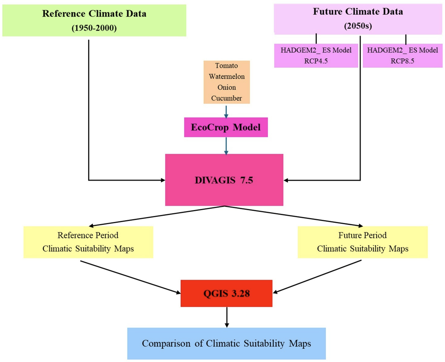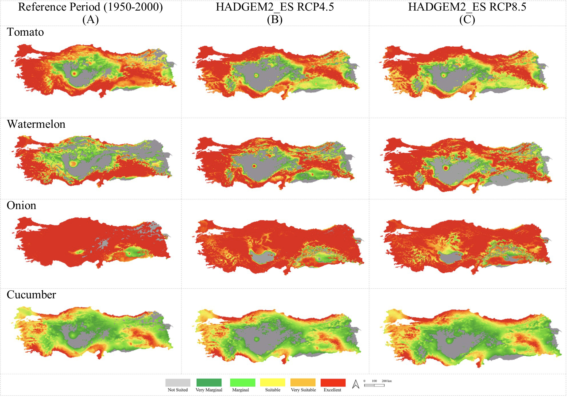 In this study, climatic suitability maps were generated for four different vegetables (tomato, watermelon, onion, and cucumber), which play a significant role in human nutrition. Since the climatic suitability maps were modeled for four crops, it was thought that it would be more appropriate to use only one climate model (HadGEM2_ES model, the most comprehensive version of the HadGEM2 series) and two scenarios (RCP4.5 and RCP8.5) due to the high plant diversity. There are many reasons why the HadGEM2_ES model RCP4.5 and RCP8.5 scenarios are preferred. Firstly, climate predictions have been made using these models and scenarios in Türkiye (Akçakaya et al., 2013; Akçakaya et al., 2015; GDWM, 2016). This is very important in terms of comparability. Moreover, it was also determined that the HadGEM2_ES model produced highly accurate estimates of temperature data (Deveci, 2025). The scenarios used in this research were RCP scenarios within the scope of AR5. As is well known, RCP scenarios directly consider radiative forcing and are classified according to the energy balance that will be achieved by 2100. These scenarios are simple to implement and are compatible with the contents of CMIP5 (Coupled Model Intercomparison Project Phase 5) and CMIP6 (Coupled Model Intercomparison Project Phase 6). RCP scenarios are currently employed by many researchers, particularly in conjunction with SSP (Deveci et al., 2025; Dokuyucu et al., 2025; Duvan et al., 2025; Khazaei, 2025; Zhang et al., 2025).