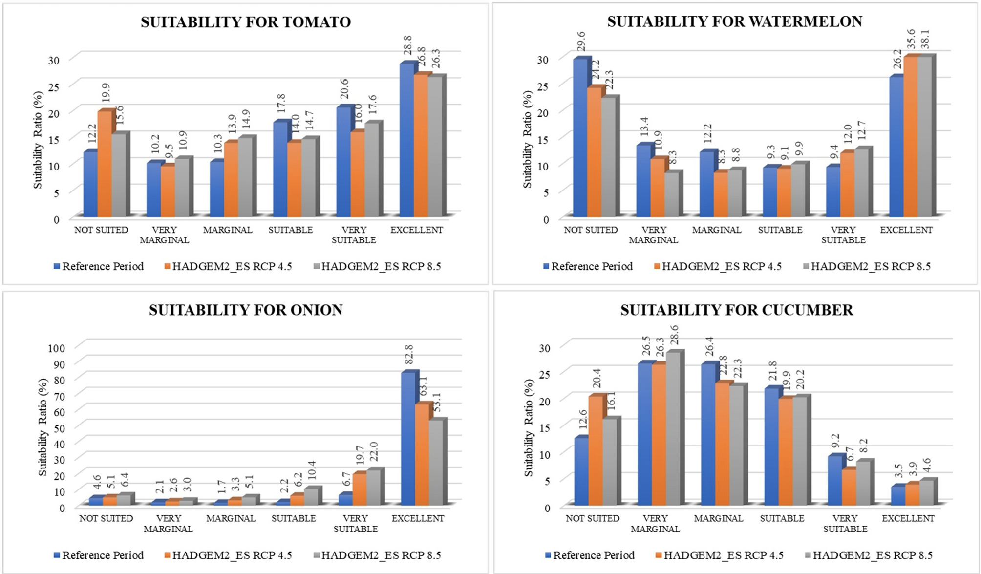The climatic suitability obtained for reference and future periods for tomato, watermelon, onion, and cucumber is presented in Figure 3. When reference and future period climatic suitability results for tomato were evaluated, it was determined that not suited and marginal areas increased in both scenarios, and suitable, very suitable, and excellent areas decreased in both scenarios according to the reference period. In the 2050s, very marginal areas increased in the HADGEM2_ES model RCP8.5 and decreased in RCP4.5. In watermelon, in both scenarios, very suitable and excellent areas increased, while unsuitable, very marginal, and marginal areas decreased. Suitable areas increased to RCP8.5 and decreased to RCP4.5 compared to the reference period. When the climatic suitability results for onion were evaluated in the 2050s, it was determined that the excellent areas decreased in both scenarios compared to the reference period, while all other areas (unsuitable, very marginal, marginal, suitable, and very suitable areas) increased. In the future, in cucumber, while not suited and excellent areas increased in both scenarios, marginal, suitable, and very suitable areas decreased. Very marginal areas decreased to RCP4.5 and increased to RCP8.5 compared to the reference period.