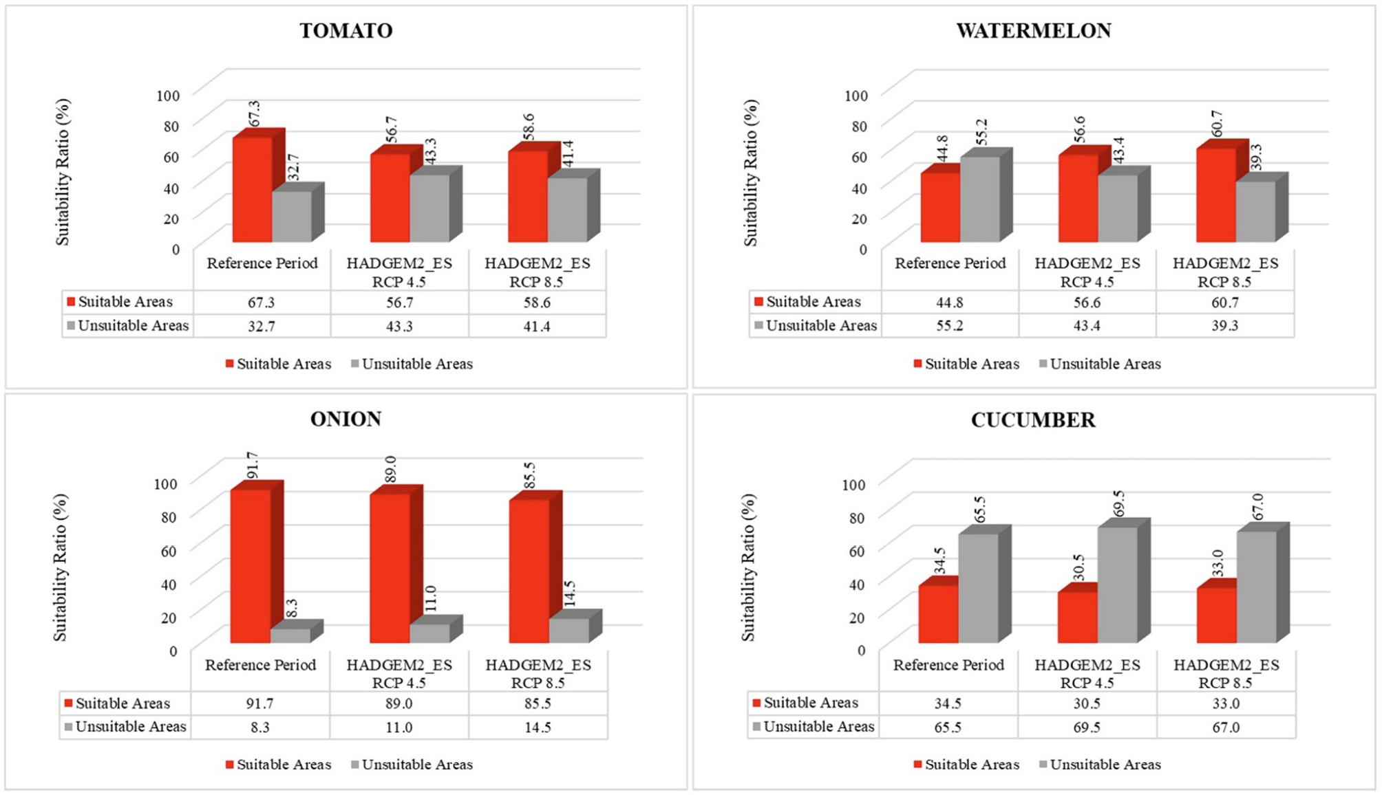 The change of suitable and unsuitable areas for tomato, watermelon, onion, and cucumber cultivation in Türkiye in the 2050s compared to the reference period in line with the HADGEM2_ES model RCP4.5 and RCP8.5 scenarios is summarized in Table 3. In the 2050s, suitable areas for tomato cultivation are projected to decrease by (13%-16%) and unsuitable areas are projected to increase by (26%-32%); suitable areas for onion cultivation are projected to decrease by (3%-7%) and unsuitable areas are projected to increase by (32%-74%); suitable areas for cucumber cultivation are projected to decrease by (4%-12%) and unsuitable areas are projected to increase by (2%-6%); suitable areas for watermelon cultivation are projected to increase by (26%-35%) and unsuitable areas are projected to decrease by (21%-29%). In general, it is estimated that watermelon cultivated areas will be positively affected, and tomato, onion, and cucumber cultivated areas will be negatively affected by the possible climate change in the 2050s.