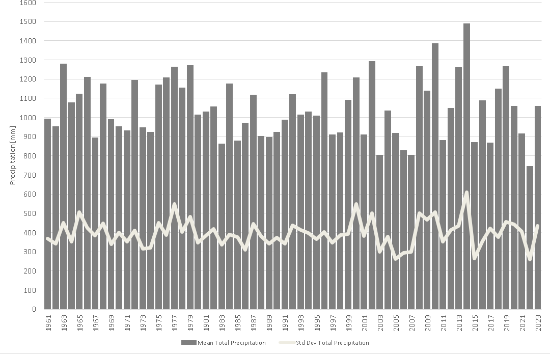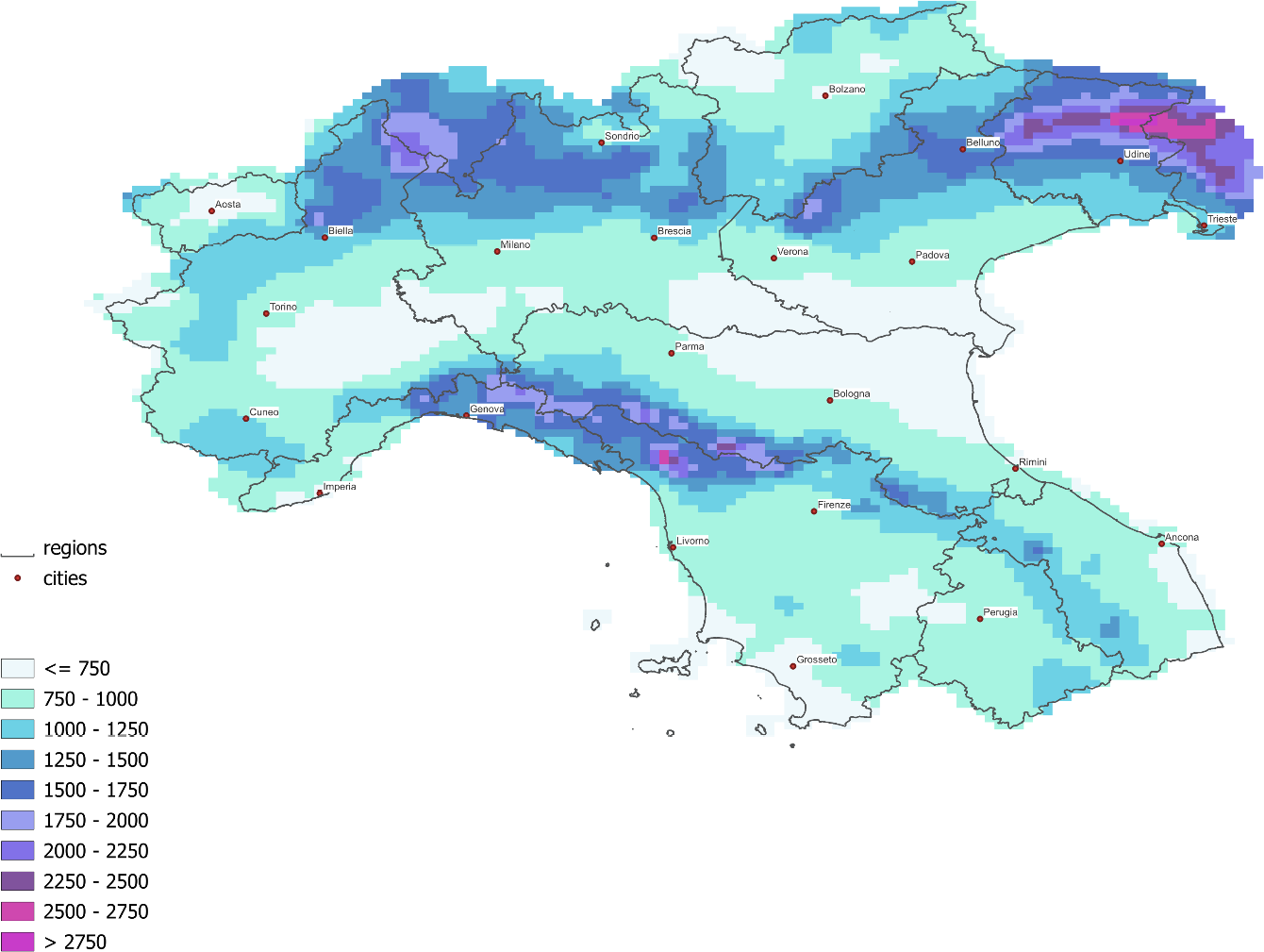 The total yearly average precipitation (period 1961-2023) of the ARCIS area is shown in Fig. 1. The map reveals the heavy influence of topography on the precipitation field. It is worth noting that mountainous regions (pre-Alpine areas and North Apennines) receive the highest rainfall, while plains, the interior of the Alps and coastal areas, experience lower precipitation. The mean yearly precipitation pattern is substantially stable over time, as demonstrated by the evident similarity to maps referred to previous periods 1921-50 (Mori, 1964), 1921-70 (Cati, 1981) and 1971-1990 (Frei and Schar, 1998). This is relevant to meet the water needs of agriculture and other socio-economic sectors.