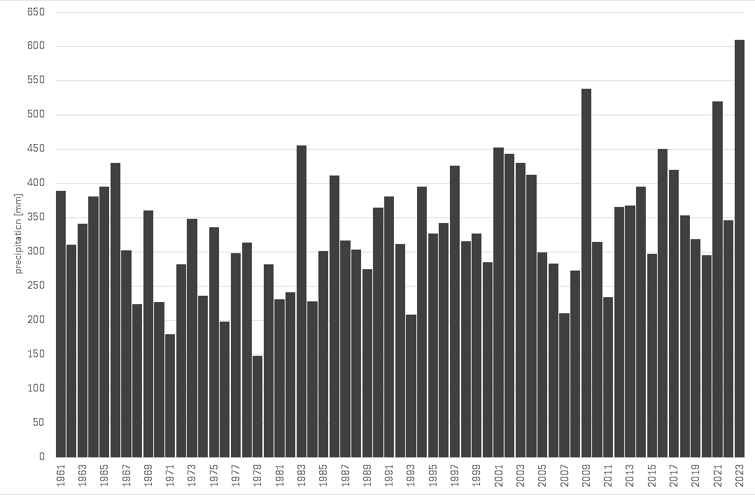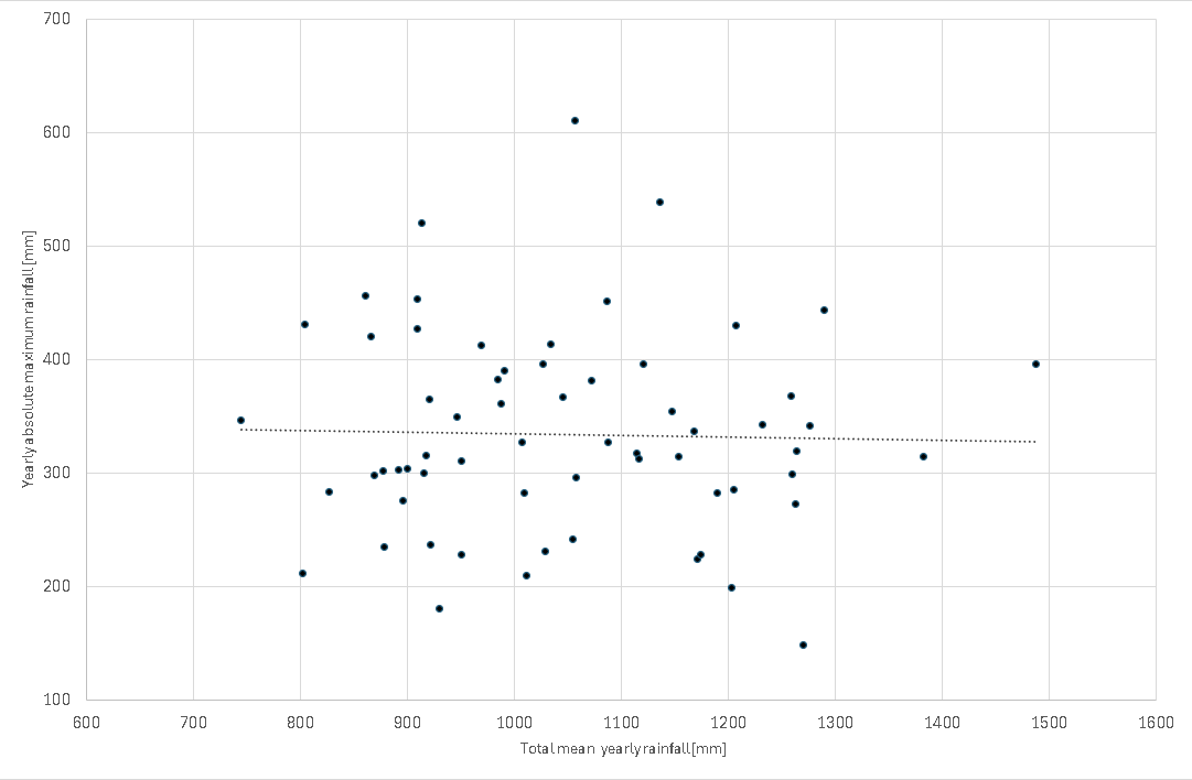 The diagram of the annual absolute maximum daily rainfall values from 1961 to 2023 for the whole ARCIS area (Fig. 4) shows high inter-annual variability with maxima not infrequently exceeding 400 mm. The whole time series shows a positive trend that is very close to the 95% threshold of significance (Mann - Kendall test: S :331; Z:1.9573; p (no trend): 0.050309).