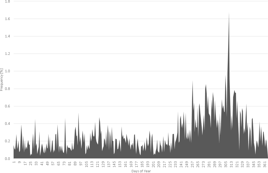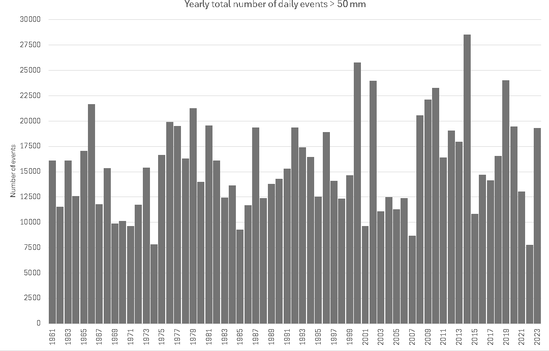 Fig. 12 plots the average daily frequency of events > 50 mm on the period 1961-2023, where there is a clear dominance of events during October/November periods.