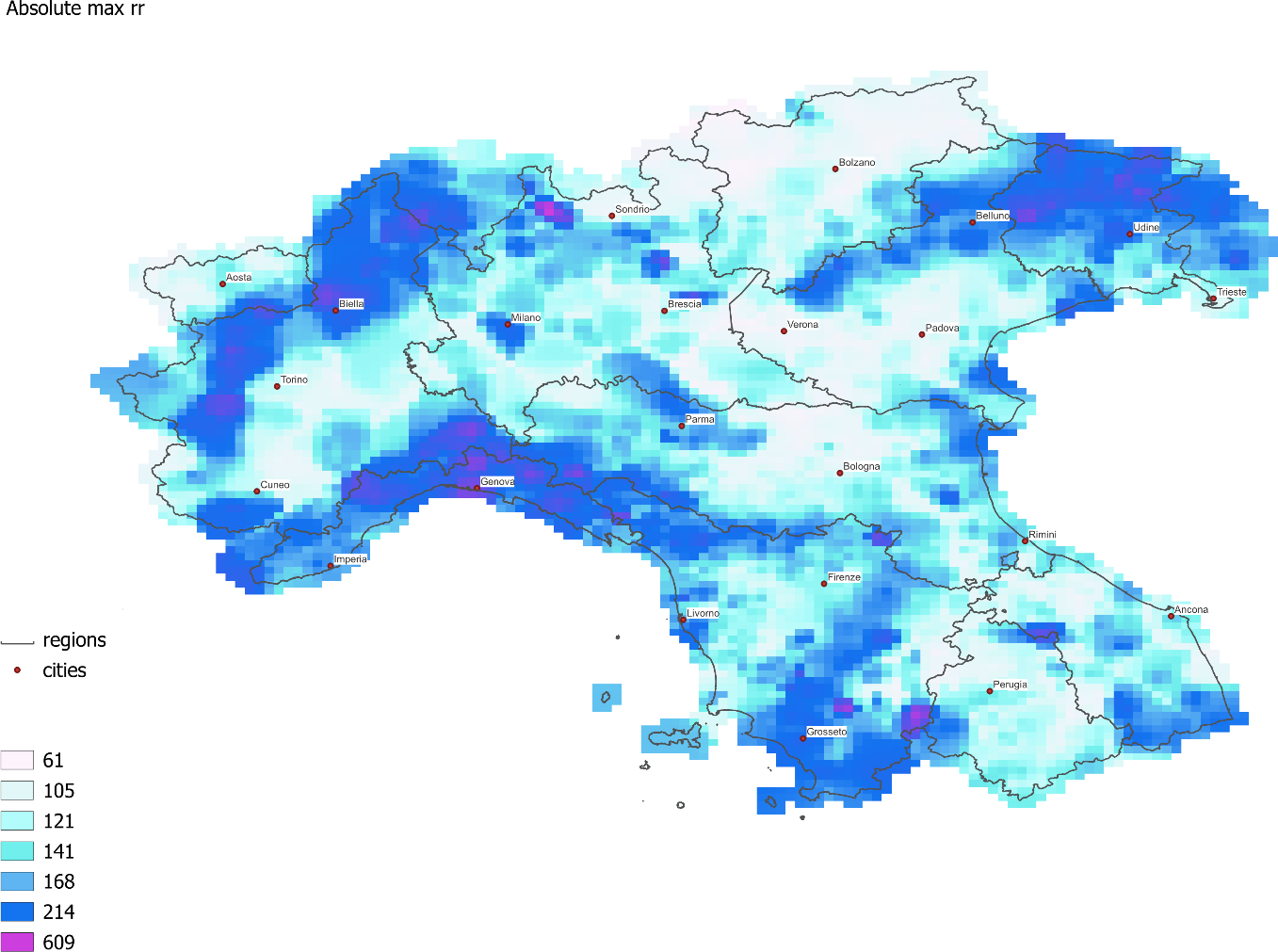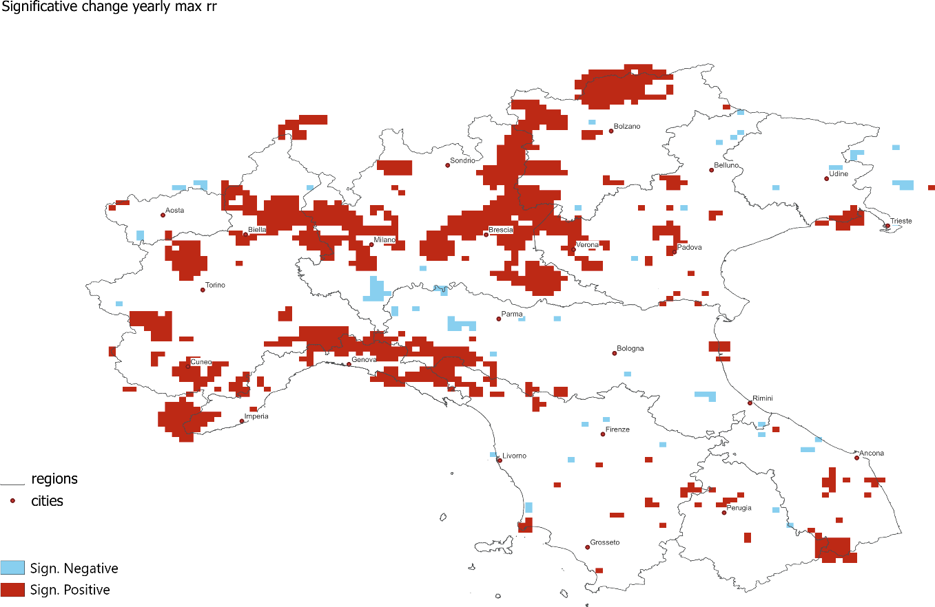 From the analysis carried out it emerges that changes in the regime of precipitation extremes highlighted by ARCIS dataset are not evenly distributed. In fact, the signal of intensification mainly concerns specific areas of some North Italy regions (Piemonte, Lombardia, Liguria, Trentino Alto Adige e Veneto) while Friuli Venezia Giulia, Emilia Romagna and the Central Italy regions show an overall absence of trends.