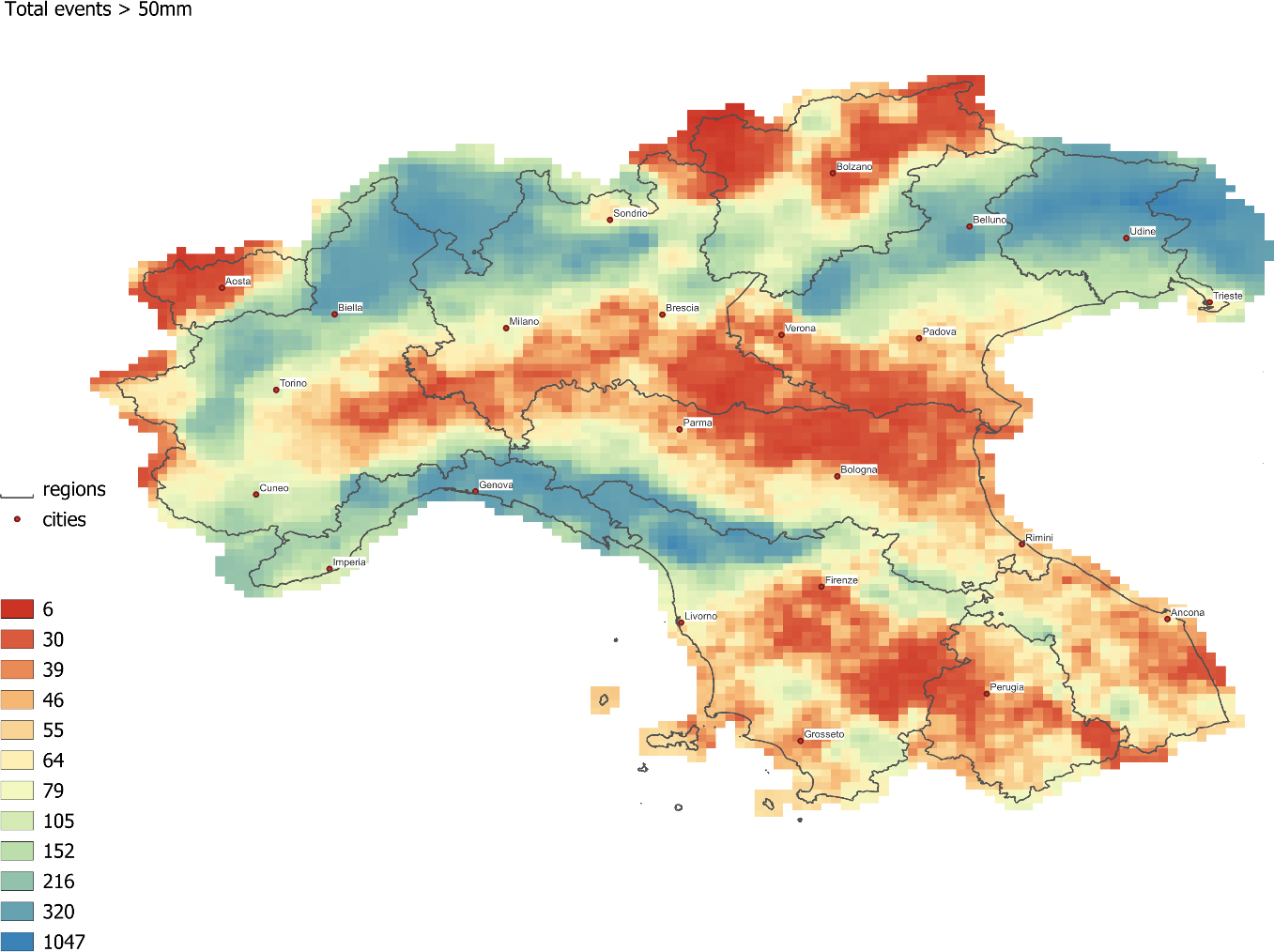 The map in Fig. 6 shows the absolute maximum daily precipitation over the whole period covered by ARCIS dataset (1961-2023) while the map in Fig. 7 shows the total number of daily events with precipitation > 50 mm. These two maps highlight the areas potentially most exposed to extreme rainfall events. Obviously, the risk of catastrophic events (landslides, floods) is the result not only of the danger of extreme rainfall events, but also of the vulnerability of the region, which is strictly related to its geo-morphological features and of the exposure to risk of populations and infrastructures. From this point of view, it should be considered that extreme events occurring in locations characterized by high average annual precipitations generally have a lower impact than extreme events of the same magnitude occurring in areas with low average annual precipitation (Libertino et al., 2016).