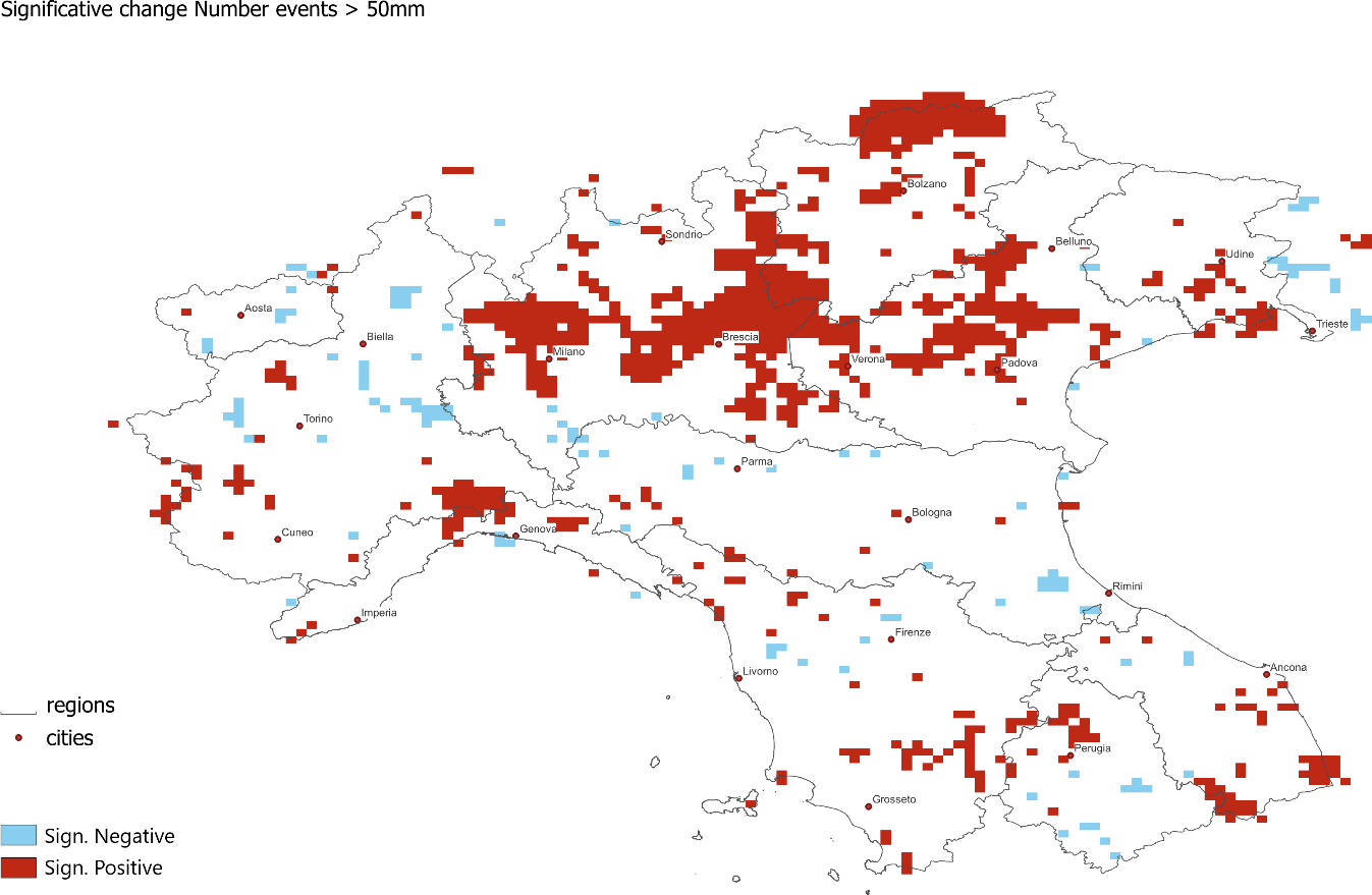 The map in Fig. 9 illustrates the yearly number of daily events greater than 50 mm significant positive or negative trends for each pixel. As already highlighted for the trends of the annual absolute maximums, it is noted that the pixels subject to a frequency decrease are isolated and never show spatially coherent aggregations. On the contrary, the pixels subject to frequency increase tend to predominate in some spatially coherent hotspots mainly affecting Lombardia, Veneto and Alto Adige.