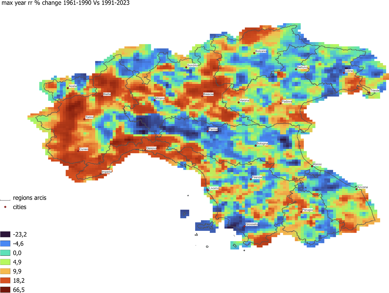 Fig. 10 shows the percentage change in absolute rainfall maxima between the two subperiods 1961-1990 and 1991-2023. The map was obtained by calculating for the two subperiods the multiyear average of annual absolute maximum daily precipitation for each pixel and the following calculation was used to obtain the percentage variation: