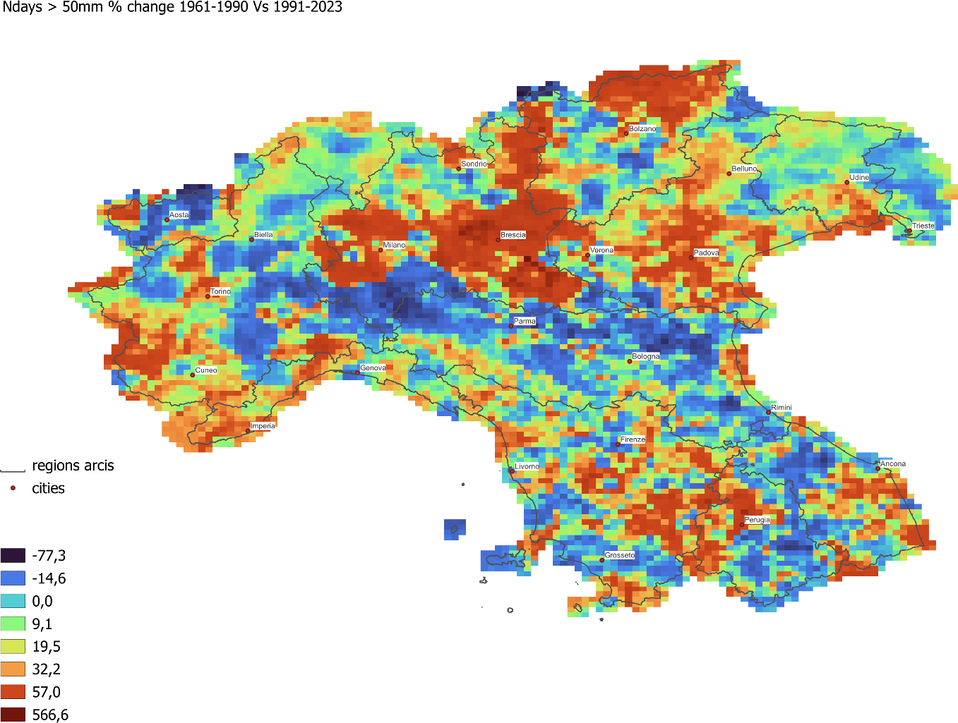 Furthermore, with reference to extreme events, the dataset allows to have updated information on the status and variability of heavy rainfall, both in terms of intensity and frequency. The presented maps, which illustrate absolute rainfall maxima, number of days with precipitation greater than 50 mm and percentage changes between the two periods (1961-1990 and 1991-2023), provide a detailed picture of such phenomena.
