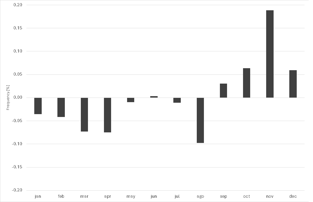 Increased frequency in autumn, mainly in November, could be possibly associated with changes in atmospheric circulation and with the increase of surface temperatures of Mediterranean sea which is the main source of humidity for precipitating systems that affect the Italian area although there is a significant contribution from Atlantic humidity in Central Northern Italy (Giustini et al., 2016).