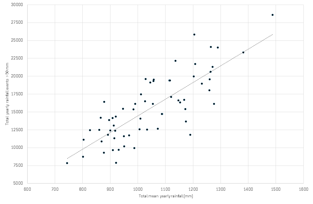 To disentangle the scale effects associated with the extreme precipitation intensity and frequency, it is useful to investigate the correlation of average yearly precipitation (Rmed) with the absolute maximum precipitation (RX_abs) (scatterplot in Fig. 14) and the number of annual events exceeding 50 mm (R>50), the latter represented in the scatterplot in Fig. 15.
