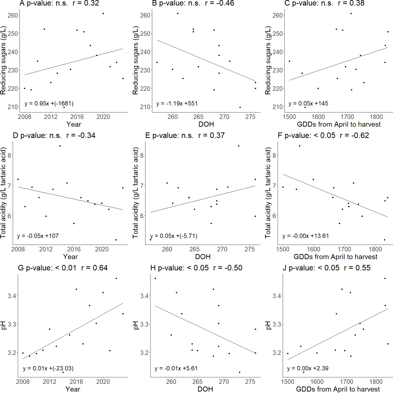 In Figure 2, although the correlation between reducing sugars and DOH was not statistically significant (p value = 0.07), it emerged that reducing sugars decreased as DOH increased, with a near-significant trend. The reducing sugars shown no statistically significant correlations with the other variables considered. A significant negative correlation was found between total acidity and GDDs (r = -0.62, p-value <0.05). For pH, both a positive trend over the years (r = 0.64, p-value <0.01) and with the GDDs (r = 0.55, p-value <0.05) are observed, while a significant negative correlation was found with DOH (r = -0.50, p-value <0.05).