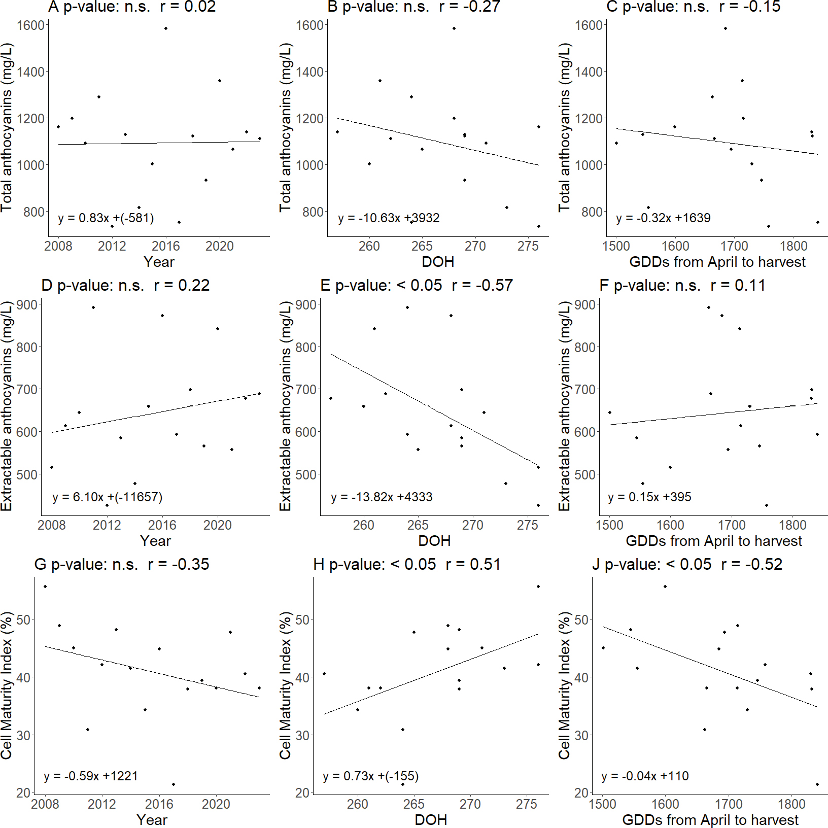 As shown in Figure 1, the correlation between the year and the GDDs from April to October (r =0.71, p-value < 0.01), suggested that, over the years, there had been a significant increase in the heat units accumulated during the growing season. With the rise in temperatures over the years, a direct correlation was observed between the year and the number of days with temperatures exceeding 35 °C (r =0.56, p-value < 0.05). The significant correlation between the year and the DOH was explained by the fact that as the years progressed, the harvest dates occured in advance (r =-0.65, p-value < 0.01), indicating a significant tendency. Despite the progressively earlier harvest, which reduced the number of days from April 1 to harvest, GDDs at DOH continued to increase (r = 0.49, p-value > 0.05).